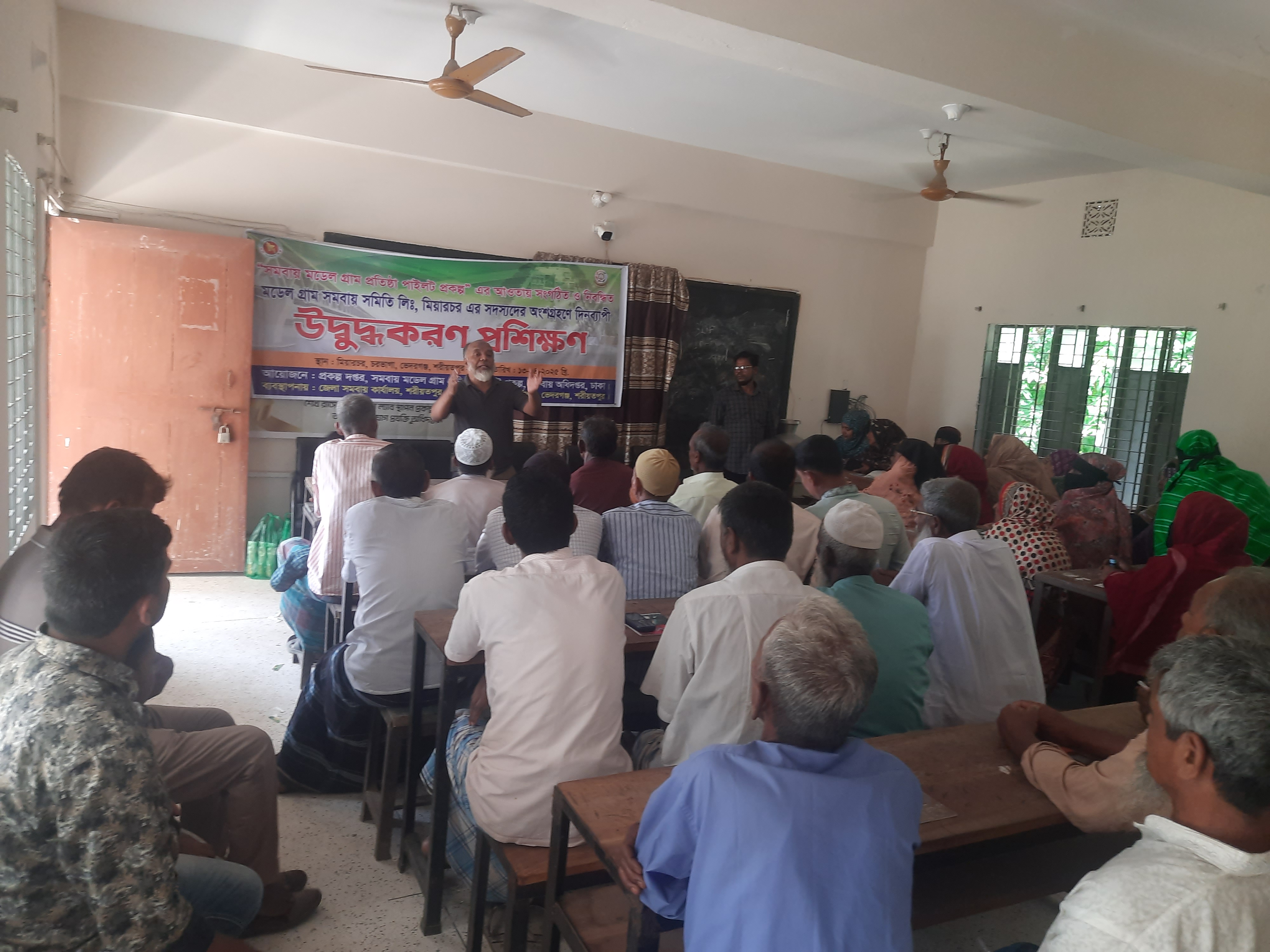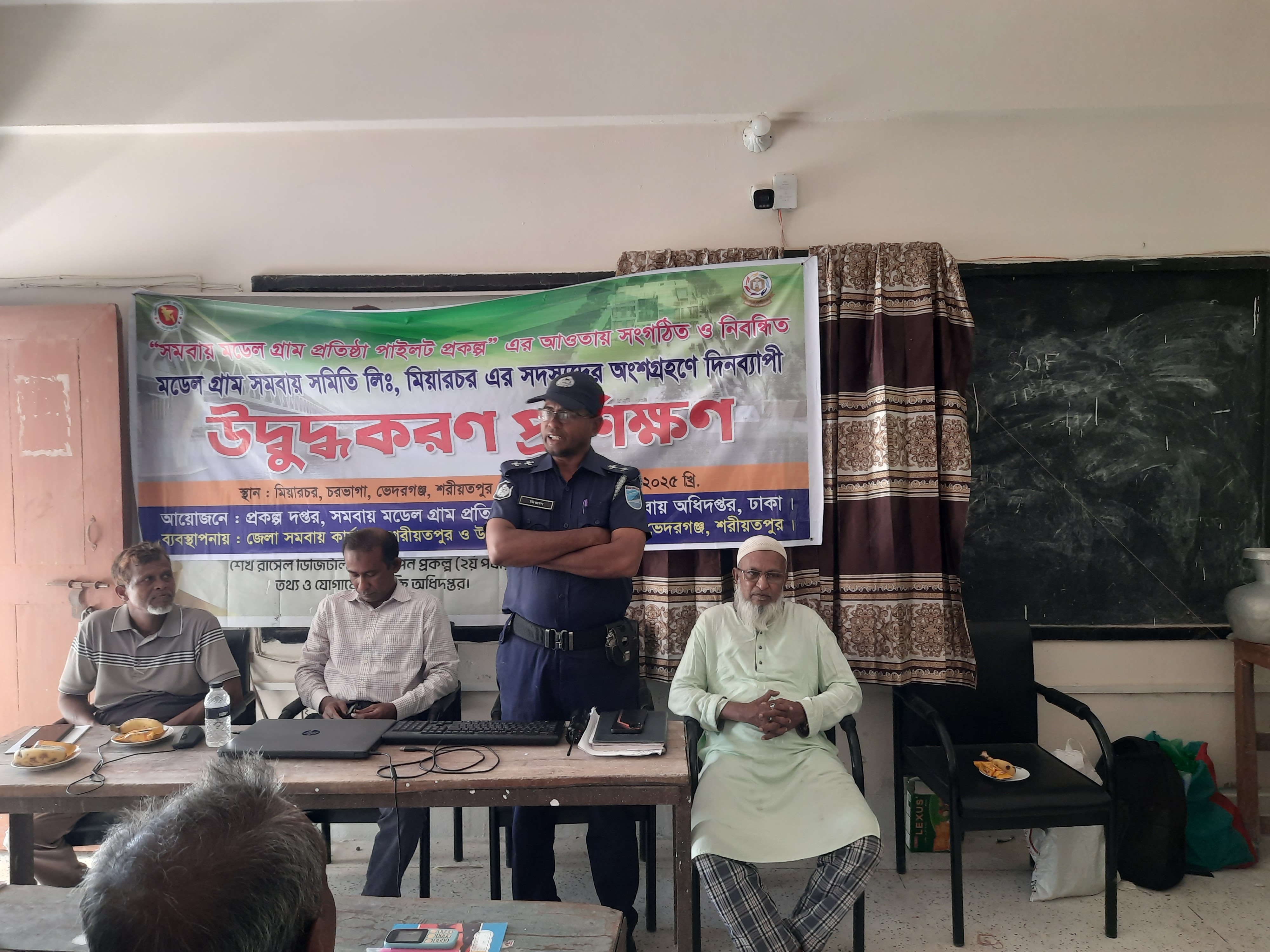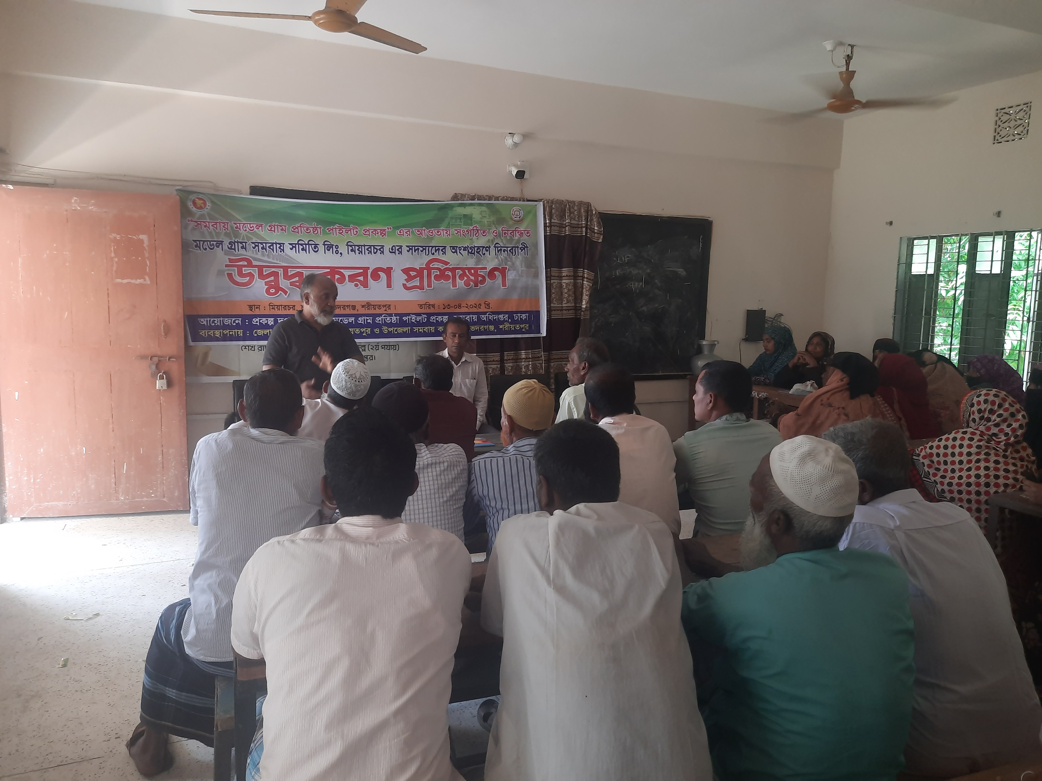 ১৩-০৪-২০২৫ খ্রি. তারিখ রোজ রবিবার সমবায় অধিদপ্তর, ঢাকা কর্তৃক বাস্তবায়িত সমবায় মডেল গ্রাম প্রতিষ্ঠা পাইলট প্রকল্পের আওতায় সংগঠিত ও নিবন্ধিত মডেল গ্রাম সমবায় সমিতি লিমিটেড, মিয়ারচর, ভেদরগঞ্জ, শরীয়তপুর এর ৬০ জন সদস্যের অংশগ্রহণে দিনব্যাপী উদ্বুদ্ধকরণ প্রশিক্ষণ কোর্স অনুষ্ঠিত হয়েছে। প্রশিক্ষণ কোর্সে রিসোর্স পারসন হিসেবে উপস্থিত ছিলেন জনাব ডাক্তার মোঃ আতিকুর রহমান মিয়া, উপজেলা প্রাণি সম্পদ কর্মকর্তা, ভেদরগঞ্জ, শরীয়তপুর ও ভারপ্রাপ্ত কর্মকর্তা, সখিপুর থানা, এর প্রতিনিধি। উপজেলা প্রাণি সম্পদ কর্মকর্তা, ভেদরগঞ্জ, শরীয়তপুর মহোদয় গবাদী পশু পালন পদ্ধতি, রোগ ও তার প্রতিকার এবং পশু পালনে আধুনিক প্রযুক্তির ব্যবহার সম্পর্কিত বিষয়ে আলোচনা করেন। ভারপ্রাপ্ত কর্মকর্তা, সখিপুর থানা, এর প্রতিনিধি পুলিশ বিভাগের সেবা ও সেবাদান পদ্ধতি সম্পর্কে আলোচনা করেন। অনুষ্ঠিত প্রশিক্ষণ কোর্সে আলোচ্য প্রকল্পের প্রকল্প পরিচালক জনাব মোহাম্মদ হেলাল উদ্দিন, যুগ্ম-নিবন্ধক, সমবায় অধিদপ্তর, ঢাকা মহোদয় ভার্চুয়ালি অংশ গ্রহণ করেন। তিনি ঋণের সঠিক ব্যবহার, নিয়মিত সঞ্চয় আমানত জমাদান, নিয়মিত ঋণের কিস্তি প্রদান ও আধুনিক প্রযুক্তি -পদ্ধতির ব্যবহার করে উৎপাদন বৃদ্বি সম্পর্কে গুরুত্বপূর্ণ ও দিক নির্দেশনামূলক আলোচনা করেন। অনুষ্ঠিত প্রশিক্ষণ কোর্সের কোর্স পরিচালক হিসেবে দায়িত্ব পালন করেন জনাব মোহাম্মদ মোফাজ্জল হোসেন, উপজেলা সমবায় কর্মকর্তা, ভেদরগঞ্জ, শরীয়তপুর।