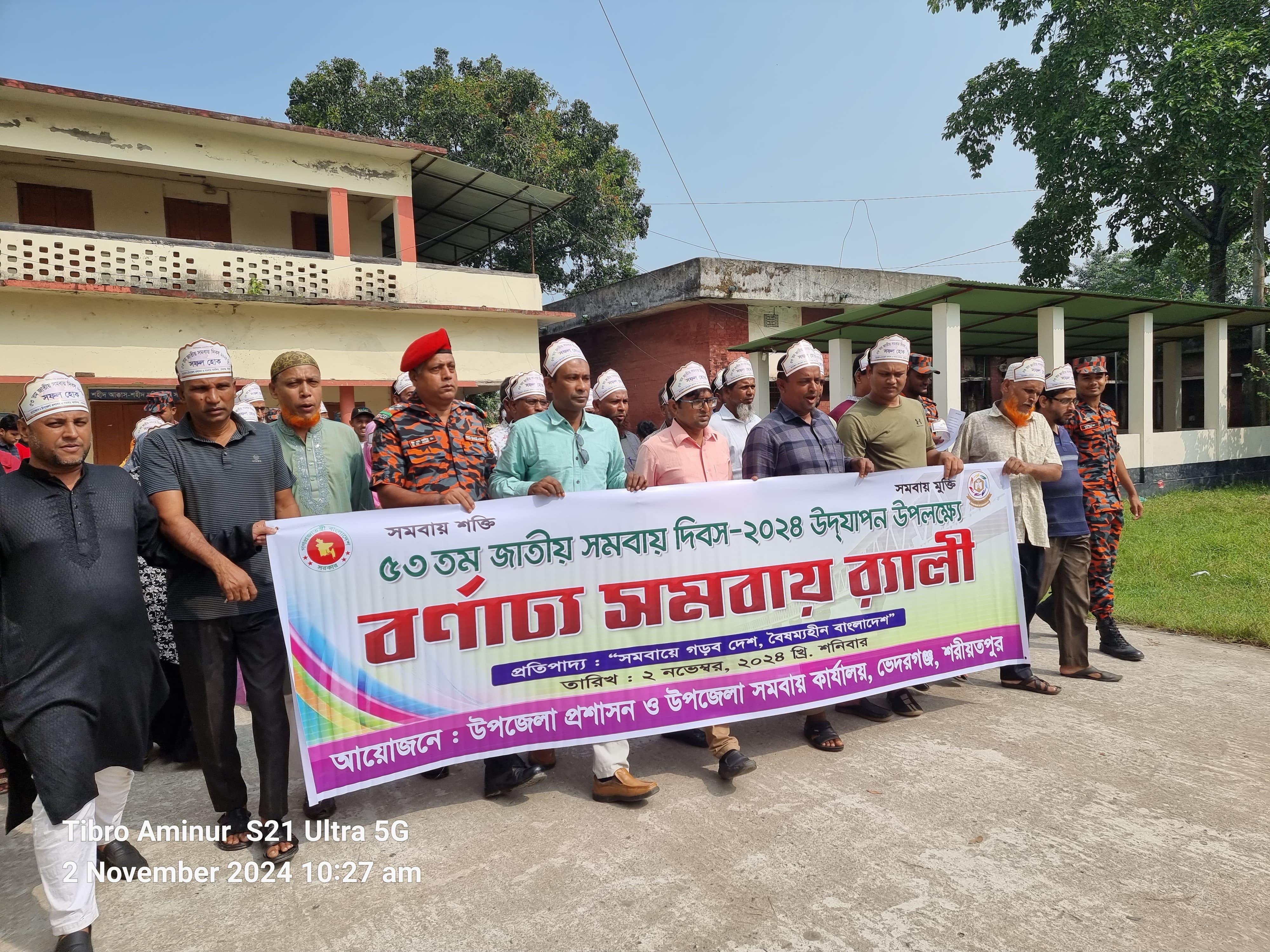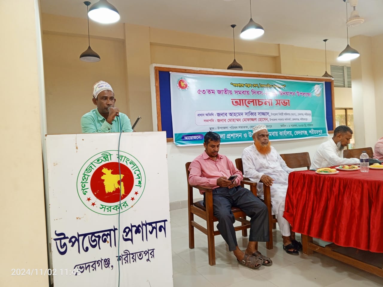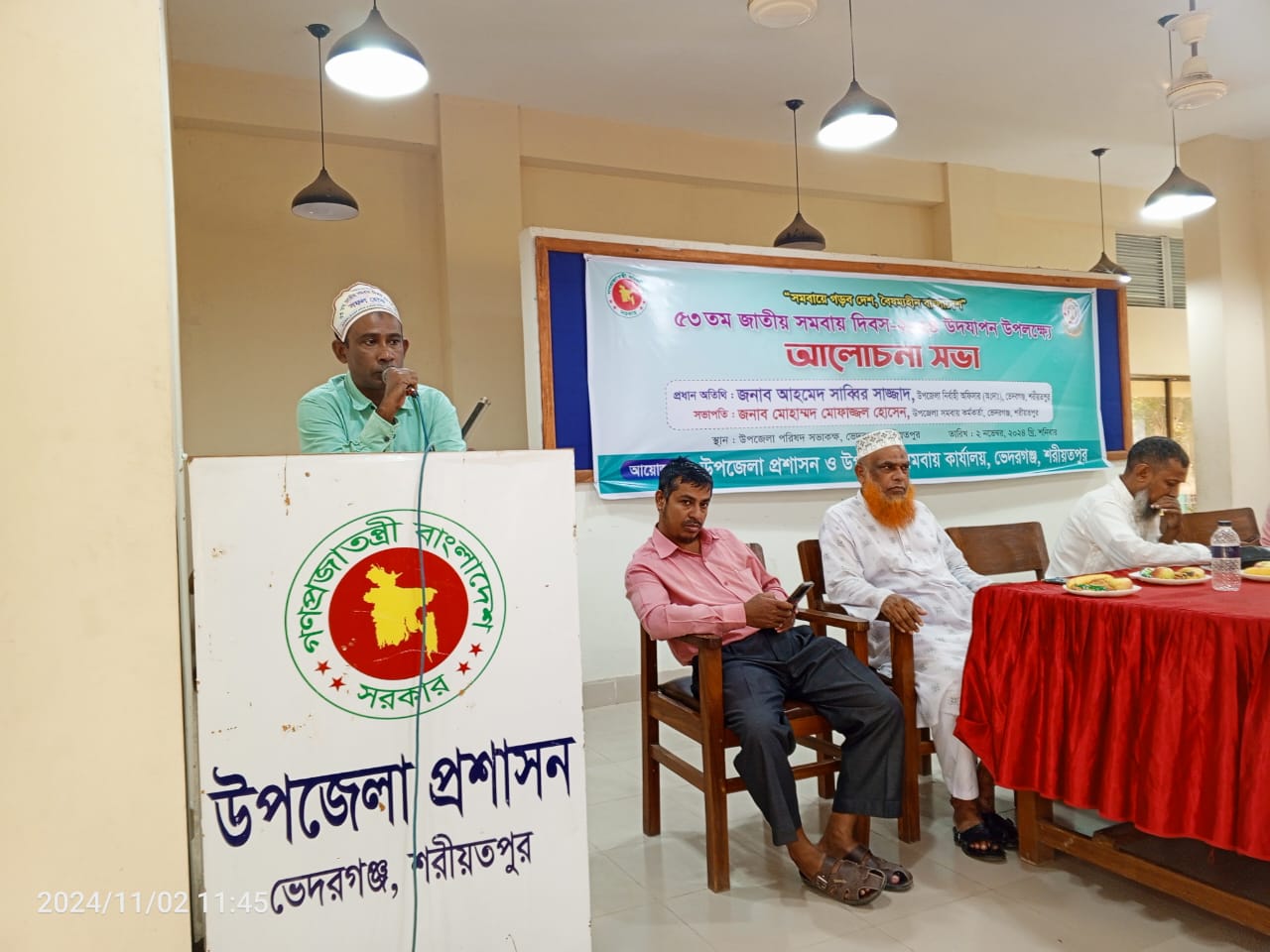 গত ০২-১১-২০২৪ খ্রি. তারিখ রোজ শনিবার সারা দেশের ন্যয় ভেদরগঞ্জ উপজেলায়ও জাঁকজমকভাবে ৫৩তম জাতীয় সমবায় দিবস ২০২৪ উদযাপন করা হয়। দিবস উদযাপন উপলক্ষ্যে জাতীয় সঙ্গীত বাজানোর মধ্য দিয়ে জাতীয় ও সমবায় পতাকা উত্তোলণ করা হয়। এর পর সমবায়ীদের অংশগ্রহণে এক বর্ণাঢ্য র্যালী উপজেলা পরিষদ প্রদক্ষিণ করে । দিবসের তাৎপর্য ও গুরুত্ব সম্পর্কে এক আলোচনা সভা অনুষ্ঠিত হয়। আলোচনা সভায় প্রধান অতিথি হিসেবে জনাব আহমেদ সাব্বির সাজ্জাদ, উপজেলা নির্বাহী কর্মকর্তা (অতিরিক্ত দায়িত্ব), ভেদরগঞ্জ, শরীয়তপুর মহোদয়ের উপস্থিত থাকা সম্ভব না হওয়ায় প্রধান অতিথির আসন অলংকৃত করেন জনাব মোঃ নজরুল ইসলাম, সিনিয়র উপজেলা মৎস্য কর্মকর্তা, ভেদরগঞ্জ, শরীয়তপুর। বিশেষ অতিথি হিসেবে উপস্থিত ছিলেন (ক) জনাব জি.এম. আমির হোসেন, স্টেশন অফিসার, ফায়ার সার্ভিস ও রেসকিউ স্টেশন, ভেদরগঞ্জ, শরীয়তপুর, (খ) জনাবেএনামুল হক, উপজেলা কো-অর্ডিনেটর, জাইকা, (গ) জনাব মোঃ হারুনুর রশিদ, বিশিষ্ট সাংবাদিক ওউপজেলা পর্যায়ের বিভিন্ন কর্মকর্তাবৃন্দ। আলোচনা সভার সভাপত্তি করেন জনাব মোহাম্মদ মোফাজ্জল হোসেন, উপজেলা সমবায় কর্মকর্তা, ভেদরগঞ্জ, শরীয়তপুর। পবিত্র কোরআন তেলওযাত ও গীতা পাঠের মাধ্যমে সভার কার্যক্রম ষুরু করা হয়। সভায় স্বাগত বক্তব্য রাখেন মোহাম্মদ মোফাজ্জল হোসেন, উপজেলা সমবায় কর্মকর্তা, ভেদরগঞ্জ, শরীয়তপুর। এর পরে সভায় বিশষ্টি সম বায়ীদের মধ্যে ০৫ জন সমবায়ী বক্তব্য রাখেন। বিশেষ অতিথিবৃন্দ ও প্রধান অতিথি মহোদয় সভায় গুরুত্বপূর্ণ বক্তব্য প্রদান করেন।