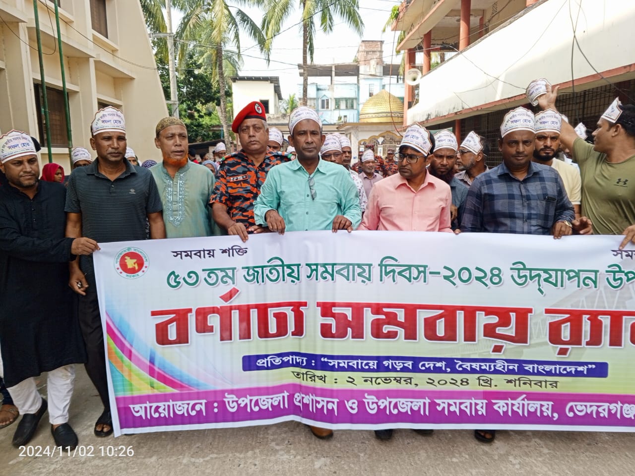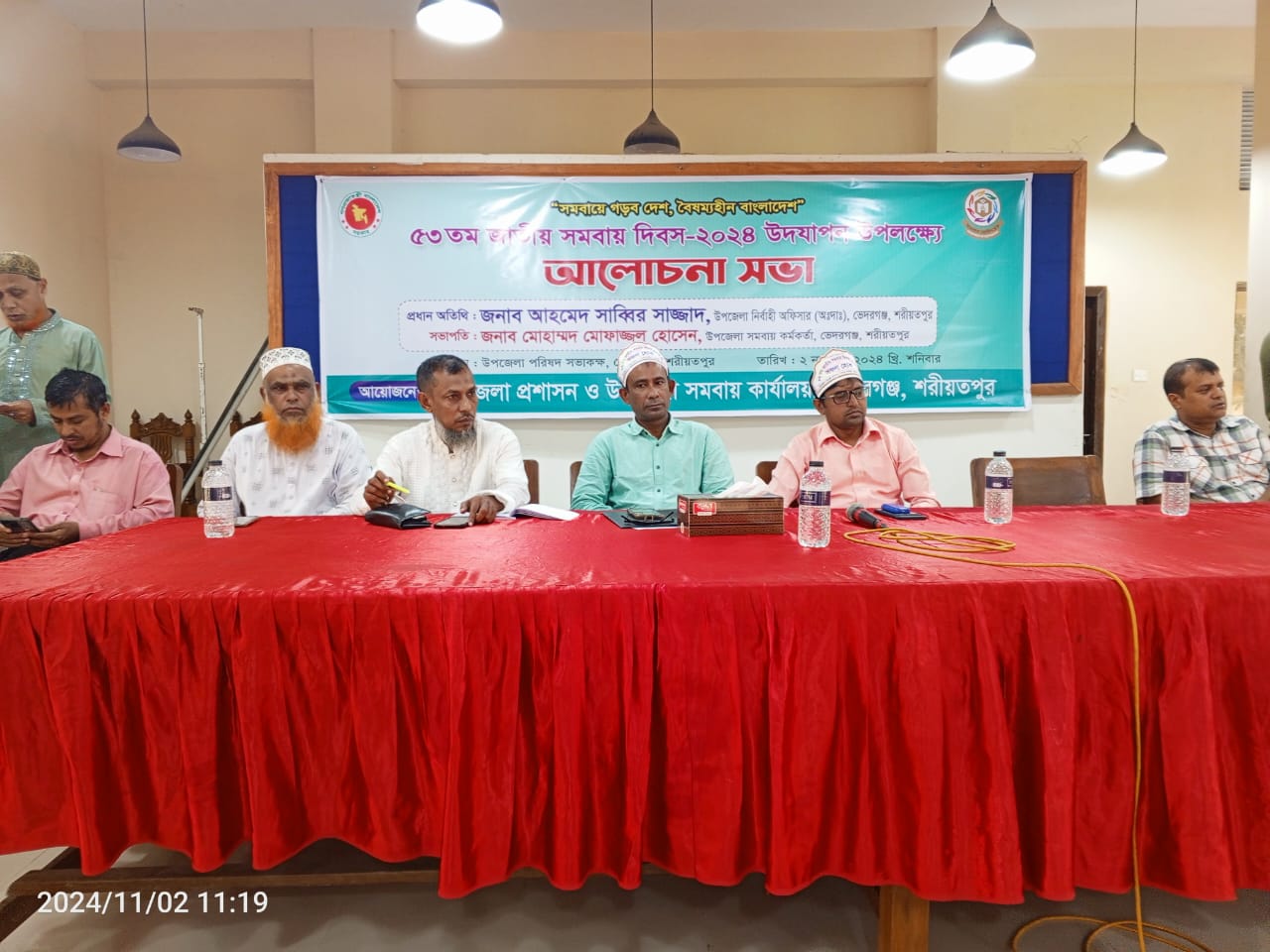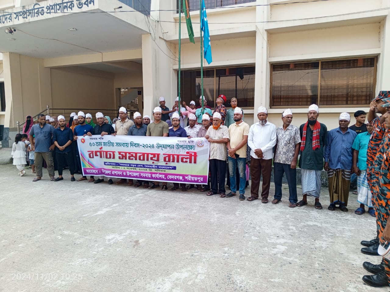 গত ০২-১১-২০২৪ খ্রি. তারিখ রোজ শনিবার সারা দেশের ন্যয় ভেদরগঞ্জ উপজেলায়ও জাঁকজমকভাবে ৫৩তম জাতীয় সমবায় দিবস ২০২৪ উদযাপন করা হয়। দিবস উদযাপন উপলক্ষ্যে জাতীয় সঙ্গীত বাজানোর মধ্য দিয়ে জাতীয় ও সমবায় পতাকা উত্তোলণ করা হয়। এর পর সমবায়ীদের অংশগ্রহণে এক বর্ণাঢ্য র্যালী উপজেলা পরিষদ প্রদক্ষিণ করে । দিবসের তাৎপর্য ও গুরুত্ব সম্পর্কে এক আলোচনা সভা অনুষ্ঠিত হয়। আলোচনা সভায় প্রধান অতিথি হিসেবে জনাব আহমেদ সাব্বির সাজ্জাদ, উপজেলা নির্বাহী কর্মকর্তা (অতিরিক্ত দায়িত্ব), ভেদরগঞ্জ, শরীয়তপুর মহোদয়ের উপস্থিত থাকা সম্ভব না হওয়ায় প্রধান অতিথির আসন অলংকৃত করেন জনাব মোঃ নজরুল ইসলাম, সিনিয়র উপজেলা মৎস্য কর্মকর্তা, ভেদরগঞ্জ, শরীয়তপুর। বিশেষ অতিথি হিসেবে উপস্থিত ছিলেন (ক) জনাব জি.এম. আমির হোসেন, স্টেশন অফিসার, ফায়ার সার্ভিস ও রেসকিউ স্টেশন, ভেদরগঞ্জ, শরীয়তপুর, (খ) জনাবেএনামুল হক, উপজেলা কো-অর্ডিনেটর, জাইকা, (গ) জনাব মোঃ হারুনুর রশিদ, বিশিষ্ট সাংবাদিক ওউপজেলা পর্যায়ের বিভিন্ন কর্মকর্তাবৃন্দ। আলোচনা সভার সভাপত্তি করেন জনাব মোহাম্মদ মোফাজ্জল হোসেন, উপজেলা সমবায় কর্মকর্তা, ভেদরগঞ্জ, শরীয়তপুর। পবিত্র কোরআন তেলওযাত ও গীতা পাঠের মাধ্যমে সভার কার্যক্রম ষুরু করা হয়। সভায় স্বাগত বক্তব্য রাখেন মোহাম্মদ মোফাজ্জল হোসেন, উপজেলা সমবায় কর্মকর্তা, ভেদরগঞ্জ, শরীয়তপুর। এর পরে সভায় বিশষ্টি সম বায়ীদের মধ্যে ০৫ জন সমবায়ী বক্তব্য রাখেন। বিশেষ অতিথিবৃন্দ ও প্রধান অতিথি মহোদয় সভায় গুরুত্বপূর্ণ বক্তব্য প্রদান করেন।